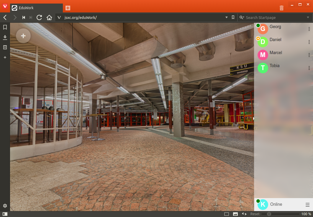 If you would like to use more screen real estate for your application, you can resize or hide the JSXC bar by dragging or clicking the vertical dividing line to the main application. A hidden JSXC bar can be restored by clicking on the right edge of the window. Your web browser will remember the bar visibility.